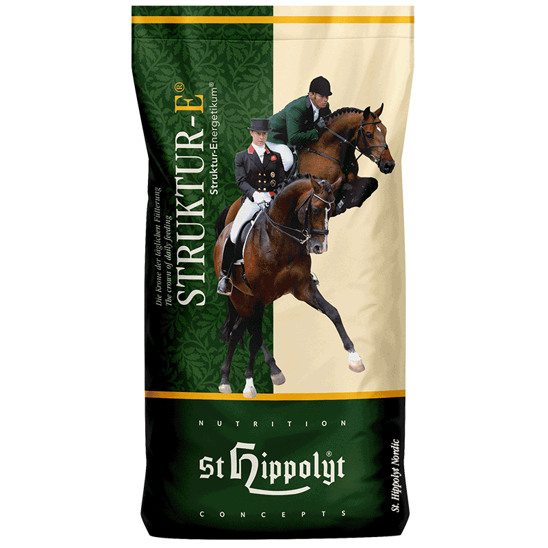 Struktur-E indeholder også hørfrø, solsikkekerner, hvede- og majskim, som alle har et højt indhold af vigtige fedtstoffer. Sammenlagt hjælper Struktur-E hestens fordøjelse til en bedre balance mellem næringsstofferne.