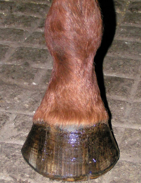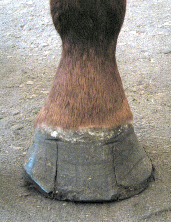 Typisk hov hos forsøgshestene før tildeling af Ungulat®. Uden forsøgsfoder: Sprøde og revnede hovvægge.