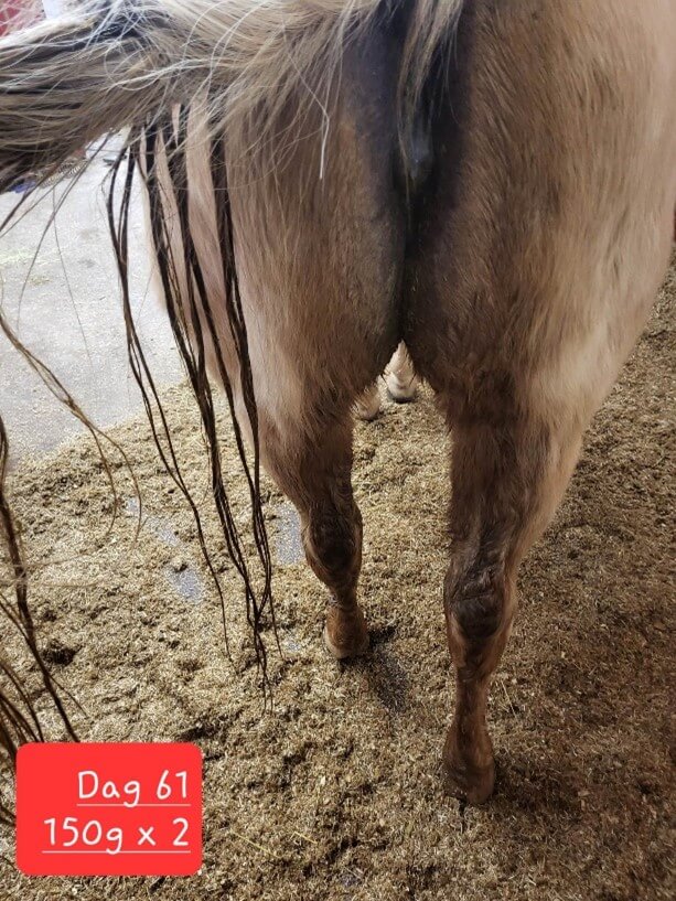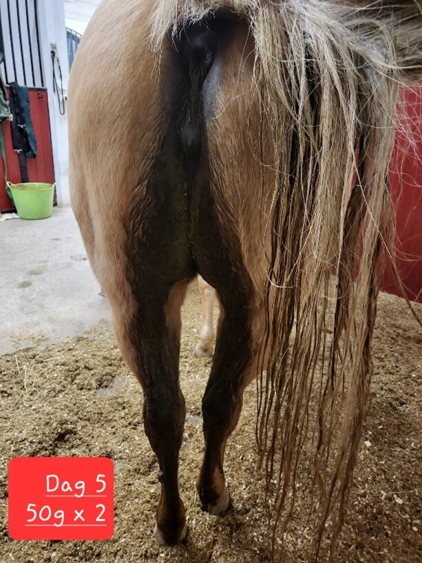 Der kommer også dyk på 2-3 dage indimellem, hvor gødningsvandet kommer i en lidt større mængde, så underbenene bliver lidt våde – men slet ikke som før. Gødningsvand forekommer stadig hos hesten, men nu i så lille mængde, at det kun ender i halen og ikke løber langs benene.