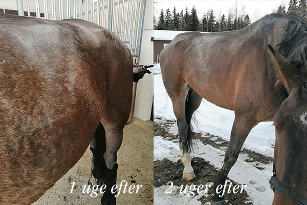 Efter start af MicroVital begyndte der at blive dannet nyt hår på de hårløse dele af kroppen inden for en uge, og hestens farve blev mørkere. På tre uger var hårdækket for det meste gendannet i de hårløse områder.