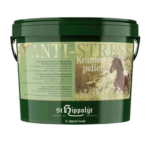 Anti-Stress Kräuterpellets er en gennemprøvet urteblanding til styrkelse af hestens psykiske stabilitet i stressende situationer.