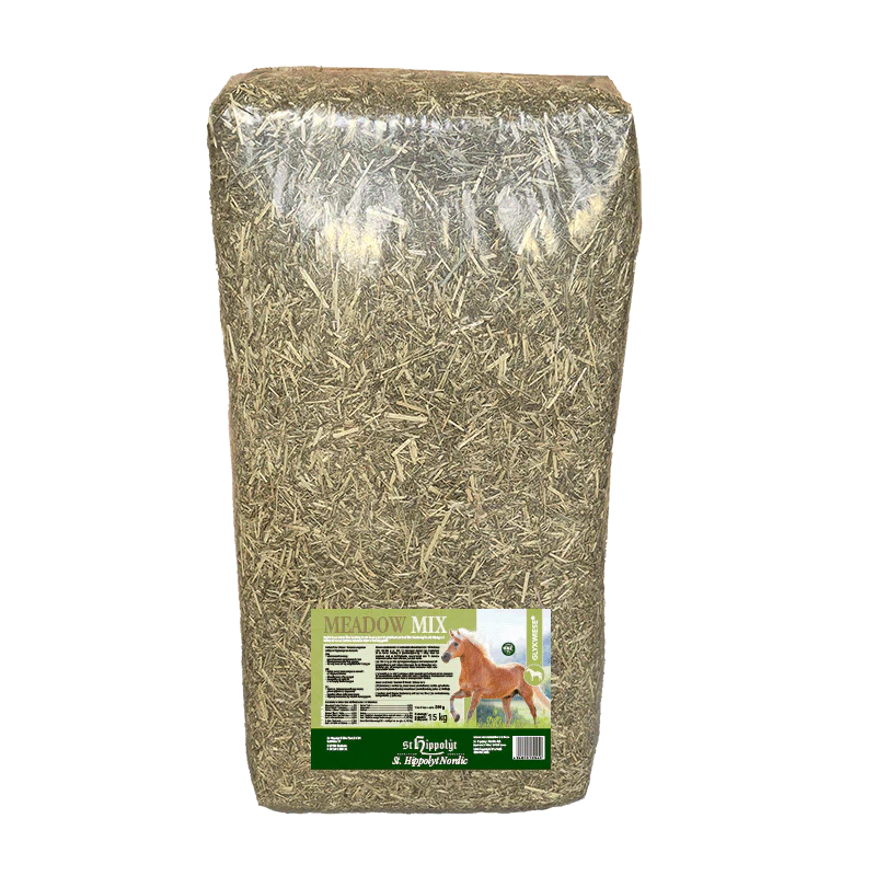 GlyxWiese® Meadow Mix kombinerer de bedste egenskaber fra lucerne, græsser og olier. Lucerne fungerer som en proteinrig erstatning for kraftfoder, og det snittede græs er af høj kvalitet. Suppleret med solsikke- og hørfrøolie skaber det en letfordøjelig og næringsrig fiberblanding, der kan have en positiv effekt på hestens tarmflora.