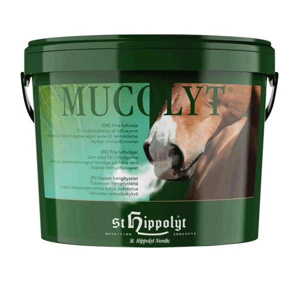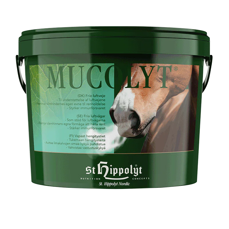 Mucolyt® er et sådant produkt. Her kombineres urterne med blandt andet C-vitamin og sporstoffer og giver derfor et produkt, som understøtter luftvejene og immunforsvaret. Især i belastede perioder, som pelsskifte, boksro, meget indetid i vinterperioden, hvor luftkvaliteten i stalden, måske er nedsat eller under ugunstige vejrforhold, er Mucolyt® en værdifuld partner til hestens basisfoder.